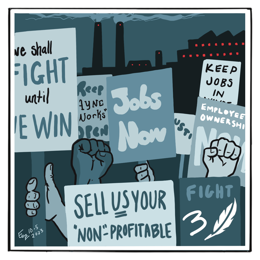I’ve tucked a handful of eggs in panels, some for fun, some symbolic like the Book of 1 Samuel and a poster that features perhaps the darkest of fathers. One panel references “Black Monday” and the Steel Mill closings in the late ‘70s—the protest signs were inspired by the employee ownership movement that started in Youngstown, Ohio (photos in this article).