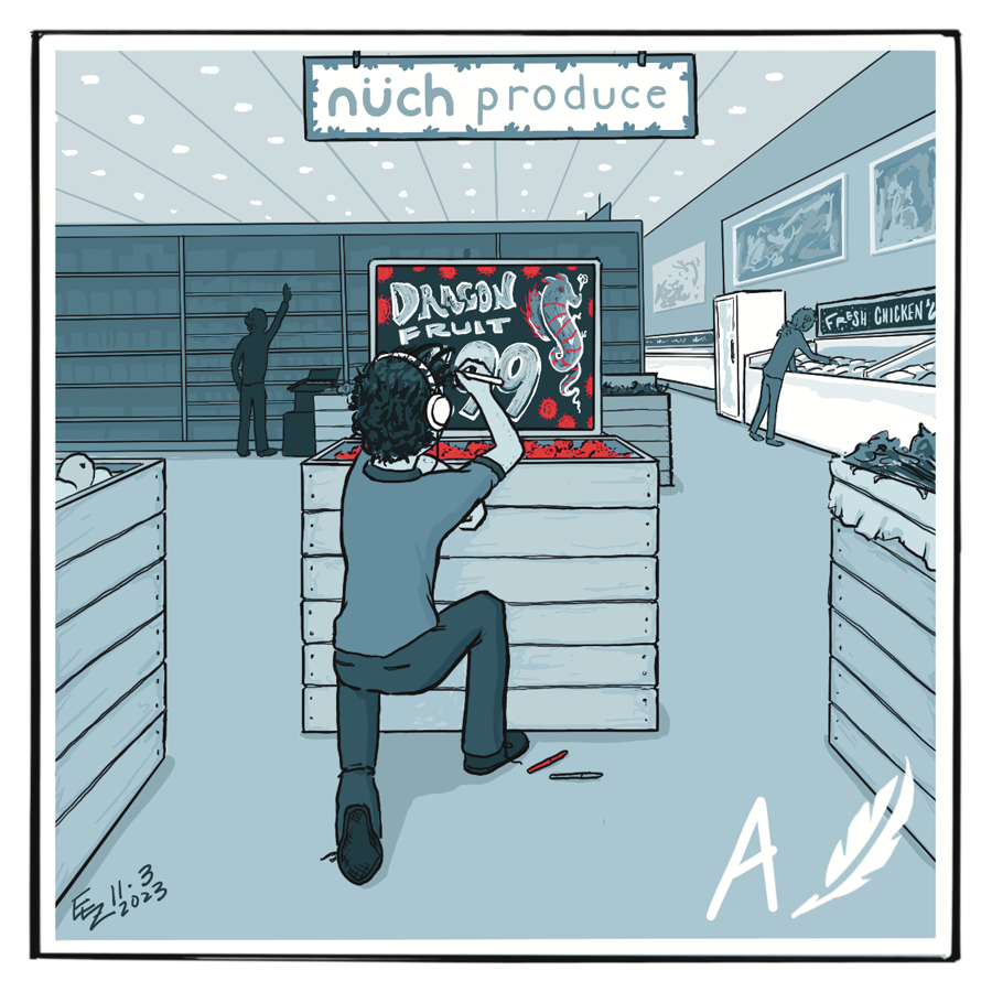 Before Toby was banished to cube life in the creative department of Nüch’s grocery conglomerate division, he was a humble sign artist, a nod to Trader Joe’s.