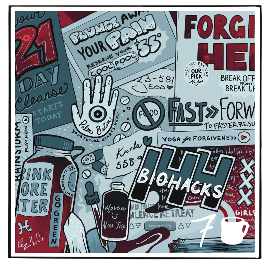 Panel 32 is Toby at the apex of this “I’ll try anything” approach, so I tried to cram as much trendy Fixe du Jour as I could (many of which I’ve tried myself). And while Toby’s mohawk shave exudes Travis Bickle vibes, it’s more likely he tried to be a transcendental monk for a hot minute.