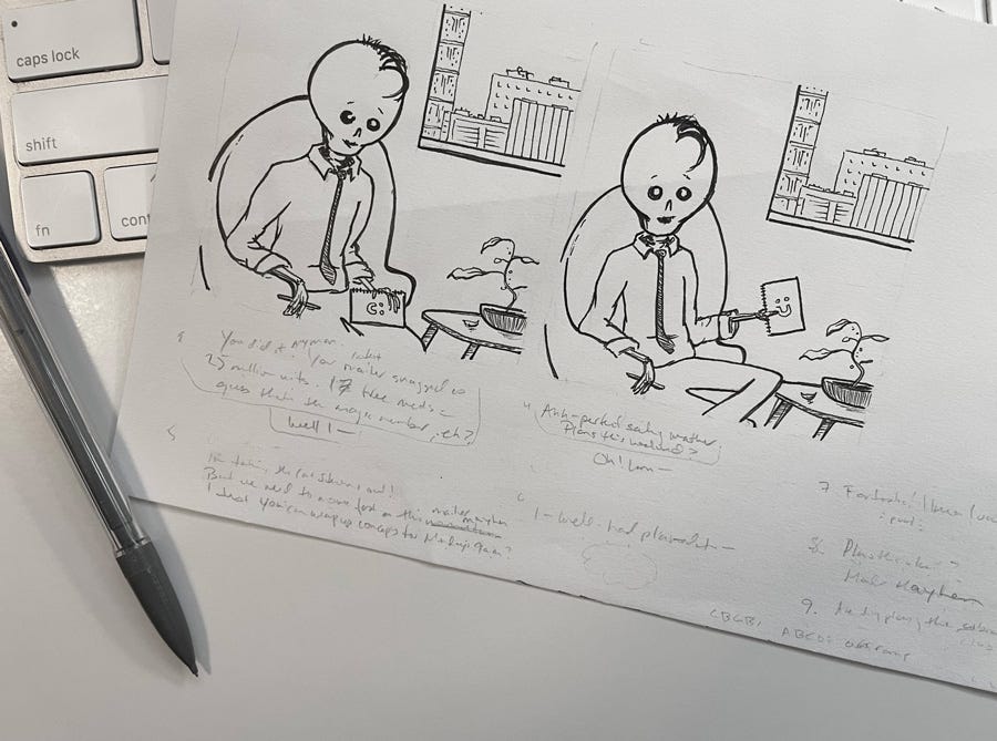 Oof, perspective. I haven’t had to draw ANYTHING in perspective for a couple decades I think. So after struggling with the big office room panel for 20 minutes, I finally just made a damn vanishing point, drew some lines with the edge of my paper, but after struggling some more, eventually just said fuck it, this is good enough.